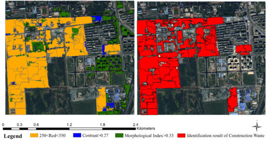 Therefore, the use of morphology not only provides morphological features for identification but also helps the higher reflectivity of construction waste to form high spatial contrast with adjacent buildings, which provides a method for the successful separation of construction waste from buildings.
