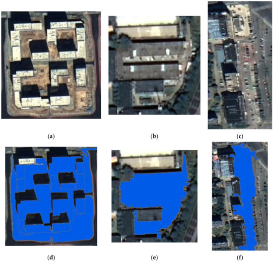 Classification results of GLCM contrast: (a–c) the original images, (d–f) the separated simple houses.