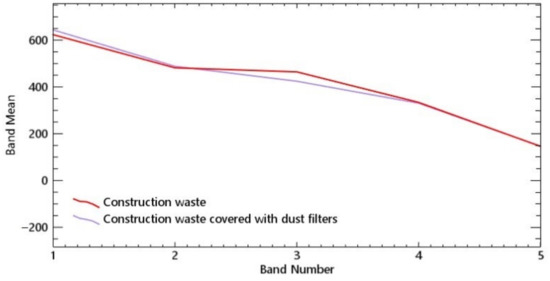 Spectral mean distribution of construction waste covered with dust screen and exposed construction waste.