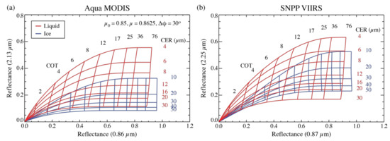 Example COT and CER solution space for liquid (red lines) and ice (blue lines) phase clouds for the (a) Aqua MODIS 0.86–2.13 µm and (b) SNPP VIIRS 0.87–2.25 µm channel pairs. The viewing geometry is denoted in the plot. Because thermodynamic phase information is indicated by a separation of the liquid and ice solution space, the VIIRS 2.25 µm channel’s phase information is more ambiguous compared with the analogous MODIS channel.