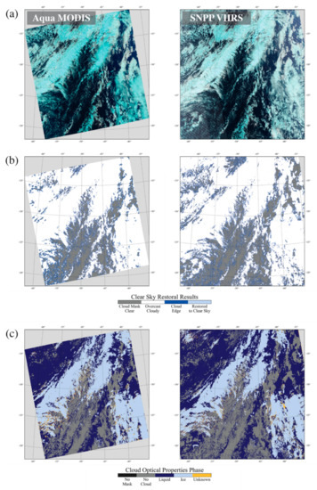 An example scene over the northern Atlantic Ocean on 29 November 2014, observed by Aqua MODIS (left column, 1630 UTC granule) and SNPP VIIRS (right column, 1624 and 1630 UTC granules) nearly simultaneously from coincident ground tracks. (a) False color SWIR-NIR-VIS composites (see text for details). (b) Results of the cloud optical properties Clear Sky Restoral algorithm (see Section 2.4.3). (c) Results of the cloud optical properties thermodynamic phase algorithm.