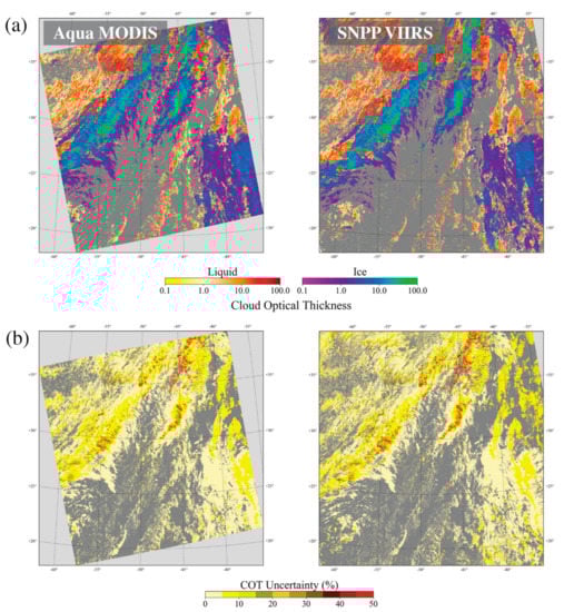Aqua MODIS and SNPP VIIRS COT retrievals for the scene in Figure 2 are shown in Figure 3a, along with their relative pixel-level uncertainties in Figure 3b. As in Figure 2, Aqua MODIS is shown in the left column and SNPP VIIRS is shown in the right column. For the COT retrievals, a dual color bar denotes thermodynamic phase, with warm colors indicating a liquid or unknown phase and cool colors indicating an ice phase. Note also that the COT retrievals are for the overcast pixel population only, as determined by the CSR algorithm, while the COT retrieval uncertainties are for the combined overcast and cloud edge pixel population (white and dark blue pixels, respectively, in Figure 2b).