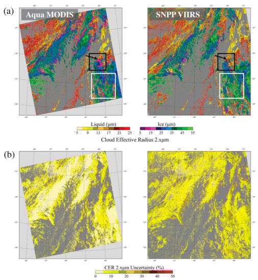 CER retrievals from the MODIS 2.13 µm and VIIRS 2.25 µm channels, collectively referred to as 2.x µm, for the scene in Figure 2 are shown in Figure 4a, along with their relative pixel-level uncertainties in Figure 4b. The results from Aqua MODIS and SNPP VIIRS again are shown in the left and right columns, respectively. A dual color bar in the CER figures denotes the thermodynamic phase. As in Figure 3, the CER retrievals are for the overcast pixel population only, as determined by the CSR algorithm, while the CER retrieval uncertainties are for the combined overcast and cloud edge pixel population. While differences between the two sensors for 2.x µm CER retrievals are evident in many parts of this scene, focusing on the likely multilayer/multiphase clouds within the regions indicated by the white and black boxes shown in Figure 4a is a useful demonstration of the challenges involved in achieving intersensor retrieval consistency. The black box is of interest because it shows a region having an abrupt phase discontinuity though the two sensors disagree on the exact location of the boundary (MODIS detecting more ice phase relative to VIIRS). The respective CER retrievals are comparable in magnitude even though the phase classification differs. In contrast, both sensors agree on a liquid phase just to the north of the boundary (location indicated by the arrow), though the MODIS 2.x µm CER is much larger than that from VIIRS, perhaps by 5 µm or more. This discrepancy can be explained by the existence of a low water cloud with an overlying optically thin ice cloud that is too thin to trigger an ice phase detection [47]. With much stronger ice absorption at 2.13 µm than at 2.25 µm (see the solution space plots in Figure 1 above, or Figure 3 in [20]), a thin ice cloud overlying a low liquid cloud depresses the TOA reflectance at 2.13 µm compared to at 2.25 µm, thus yielding larger retrieved liquid CER from MODIS. Moreover, in the heterogeneous, likely multilayer cloud region to the south, where both imagers detect ice phase clouds, VIIRS generally retrieves much larger 2.x µm CER than does MODIS, also consistent with the existence of a lower water cloud. These results in such complex scenes highlight the importance of multilayer cloud detection, which is omitted from CLDPROP due to VIIRS’s lack of NIR and IR absorption channels (see Section 2.4.3 and [46,47]), that can serve as cloud optical property retrieval QA.