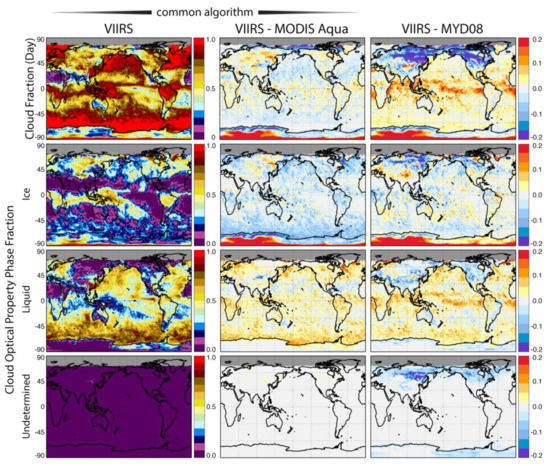 Figure 6 shows monthly daytime cloud fraction (top row) from the cloud mask and the cloud optical properties phase fractions derived from the cloud optical properties thermodynamic phase algorithm. Phase fraction is defined here as the fraction of all daytime pixel observations that are identified as either ice, liquid, or undetermined phase (rows indicated by the labels on the left), irrespective of the success of the cloud optical property retrieval algorithm, such that the sum of these three phase fractions in a given grid box equals the cloud fraction (top row) in that grid box (ignoring pixels “restored to clear sky” by the CSR algorithm–see Section 2.4.3–that are not flagged by the cloud mask algorithm). Note that the cloud fractions in the “common algorithm” columns are from the CLDMSK product [26], while the heritage MYD08 cloud fraction in the righthand column is from the MYD35 product [11,12,13]. For all three phase designations, there is no broad improvement in the phase agreement for the CLDPROP COP phase algorithm compared to that between CLDPROP VIIRS and MYD08 (with CLDPROP VIIRS showing overall smaller ice cloud fractions and larger liquid cloud fraction than either MODIS algorithm). This result perhaps is expected given that the CLDPROP COP phase algorithm is largely based on that of MYD06, with only limited modifications (see Section 2.4.3). However, there are obvious differences in the CLDMSK and heritage MYD35 daytime cloud fractions (top row) whose impacts on phase fractions are difficult to disentangle from those of phase algorithm modifications.