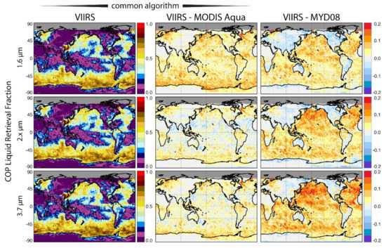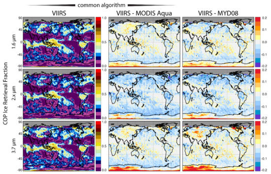 Ice and liquid cloud optical property retrieval fractions for overcast clouds for the same month are shown in Figure 7 and Figure 8, respectively. Retrieval fractions are defined as the fraction of total pixels that are identified as overcast by the CSR algorithm and result in successful cloud optical property (COT, CER) retrievals, and thus by definition are less than or equal to the ice and liquid phase fractions shown in Figure 6. Since the rate of cloud optical property retrieval success, or failure, is dependent on the SWIR or MWIR spectral channel used in the CER retrieval [54], retrieval fractions for the three core retrieval channel combinations are shown here, identified by their CER spectral channel (1.6 µm, 2.x µm, and 3.7 µm). Despite the overall smaller successful retrieval fractions, the ice cloud retrieval fractions in Figure 7 show intersensor and inter-algorithm absolute differences roughly consistent with the ice phase fraction differences in Figure 6. Likewise, the absolute differences between the MODIS and VIIRS CLDPROP products (common algorithm) are consistent with the liquid phase fraction differences in Figure 6. The CLDPROP VIIRS and MYD08 liquid retrieval fraction differences, however, are much larger over global oceans, with CLDPROP VIIRS having significantly higher retrieval fractions. This is largely due to differences in the CSR algorithms between CLDPROP and MYD06, namely the exclusion in CLDPROP of the sub-pixel cloud mask variability test that removes from the overcast pixel population those pixels over ocean that the 250 m MYD35 cloud mask tests indicate are only partially cloudy (see Section 2.4.3). Thus, the CLDPROP overcast pixel population is larger than that of MYD06, resulting in larger CLDPROP retrieval fractions than MYD08. Moreover, the exclusion of this test disproportionately affects the liquid phase pixel population since liquid clouds are generally more spatially heterogeneous than ice clouds. Nevertheless, these results highlight the importance to intersensor continuity of the common algorithm approach that applies consistent algorithm choices across all sensors.