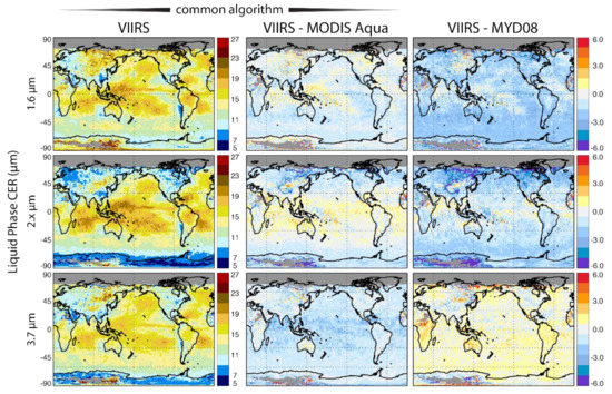 Monthly liquid CER means for the overcast pixel population in February 2014 are shown in Figure 10 for the individual CER spectral channels (1.6, 2.x, and 3.7 µm) used in the retrieval as indicated by the labels on the left. As discussed in Section 2.4.2, the CLDPROP algorithm uses different complex index of refraction datasets compared to those used by MYD06, thus the CER retrieval absolute differences between CLDPROP VIIRS and MYD08 (right column) are expected, as is the substantially improved agreement between the CLDPROP VIIRS and MODIS 2.x µm retrievals that use the same 265 K assumption (center column, middle row). VIIRS and MODIS CER differences for the 3.7 µm channels, on the other hand, flip signs for the CLDPROP continuity algorithm (center column) versus CLDPROP VIIRS and MYD08 (right column), with the continuity algorithm differences having slightly larger magnitudes. As with the SWIR channels, a refractive index change was also made for the 3.7 µm retrievals for CLDPROP, namely a 265 K dataset derived from [45] that was selected to provide consistency with the SWIR channel assumptions, at least in terms of the default cloud temperature used for forward modeling. That said, the reasons for this 3.7 µm liquid CER behavior remain unclear, and further investigation is warranted. Further details on index of refraction sensitivities for this example month are discussed in [20].