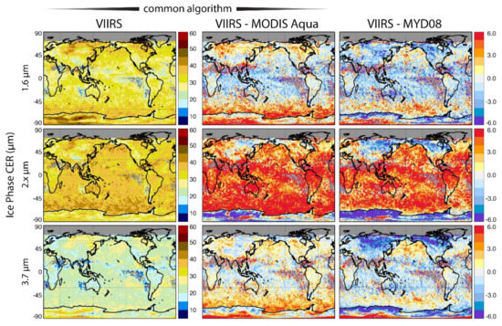 Monthly ice CER means for the overcast pixel population in February 2014 are shown in Figure 11, again separated by the CER spectral channel used in the retrieval. Similar to the COT means in Figure 9, the ice CER absolute differences shown here are noisier than those for liquid CER in Figure 10. In addition, the CLDPROP VIIRS and MODIS CER differences (center column) are quite large, particularly for the 2.x µm retrievals, for which VIIRS retrieves significantly larger CER than does MODIS, up to 6 µm or more at the monthly mean scale shown here. It is not clear if these differences for the 2.x µm channel retrievals are related to the bulk ice complex index of refraction assumption (e.g., [55] demonstrated sensitivities in the IR), as was the case for the liquid 2.x µm CER retrievals, to vertical heterogeneity arising from real microphysical process, e.g., crystal growth, sedimentation [56], or to some combination. As with the 3.7 µm liquid CER differences, further investigation into the 2.x µm ice CER differences is warranted.