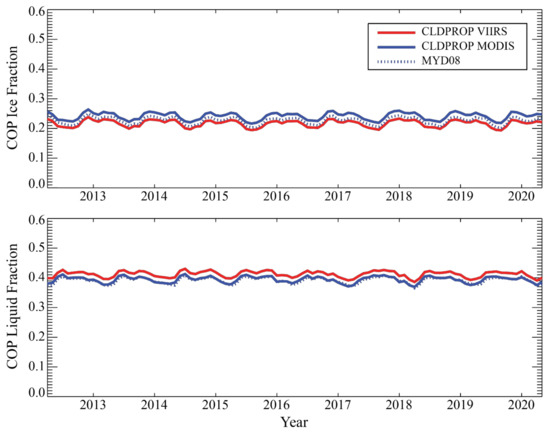 Time series of monthly ice (top) and liquid (bottom) cloud optical property phase fractions for the SNPP VIIRS (solid red line) and Aqua MODIS (solid blue line) CLDPROP products, and the heritage Aqua MODIS MYD08 (dotted blue line) product, covering the time period from April 2012 through May 2020. The monthly values are pixel-weighted calculations for ±60° latitude.