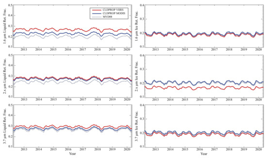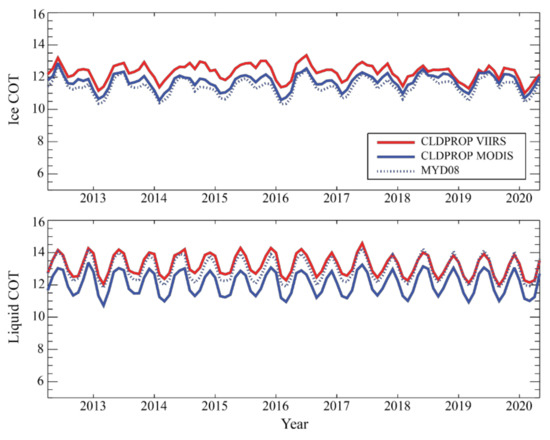 To evaluate the temporal continuity of the CLDPROP VIIRS and MODIS cloud optical properties datasets, the monthly gridded analysis of Section 3.2 is extended to a monthly time series for the common SNPP and Aqua data record from April 2012 through May 2020. Like the monthly analysis in Section 3.2, these time series are derived from the monthly global gridded products, namely v1.1 CLDPROP_M3 for the VIIRS and MODIS continuity datasets, and C6.1 MYD08_M3 for the heritage MODIS MYD06 datasets, where the monthly cloud optical properties phase fractions are once again derived from the MYD08_D3 daily product. Specifically, aggregation calculations are pixel-weighted for latitudes between 60° N and 60° S, thus excluding the polar regions, and include all surface types (land, ocean, sea ice, etc.). In all figures in this section, the VIIRS and MODIS CLDPROP datasets correspond to solid red and blue lines, respectively, while the MODIS MYD08 datasets correspond to the dotted blue lines. Therefore, the CLDPROP common algorithm paradigm for climate data record continuity across Aqua MODIS and SNPP VIIRS is supported when the solid blue and red lines are closer together than either are to the dotted blue line.