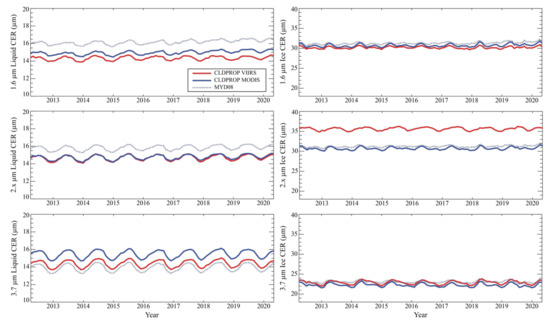 Time series of monthly liquid (left column) and ice (right column) CER means for the three primary spectral retrieval channels (1.6 µm, 2.x µm, 3.7 µm) as indicated by the labels on the left. Line style and color designations are the same as in Figure 12. The monthly values are pixel-weighted calculations for ±60° latitude, and are for the overcast pixel population only, as determined by the CSR algorithm.