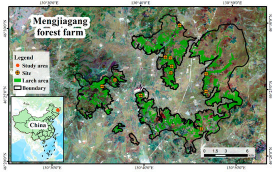 This research was conducted in Mengjiagang Forest Farm (130°32′0″–130°52′6″ E, 46°20′20″–45°30′16″ N), which is located along the western fringes of Wanda mountain in the northeastern part of Huanan County, Heilongjiang province, China. The terrain mainly features gentle slopes and low-elevation hills, with an average elevation of approximately 250 m a.s.l. [43]. The forest vegetation in the area is dominated by coniferous plantations, predominantly Pinus sylvestris var. mongolica, Pinus koraiensis, Larix olgensis, and Picea asperata.