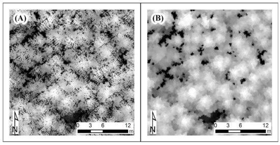 Firstly, the noise points were manually removed from the raw LiDAR point clouds. The cloth simulation filtering was utilized to categorize the remaining points into nonground and ground points [44]. Due to the dense canopy cover, the ground point cloud density is about 10 pt/m2 on average. Then, the Kriging method with a 0.5 m pixel size was used to interpolate the ground points into digital terrain models (DTMs) [45]. DTM values were subtracted to obtain the normalized height of each point [46,47]. As mentioned in early studies, data pits in the canopy height models (CHMs) disrupt the crowns’ integrity and smoothness (Figure a), which negatively affects the individual crown delineation and parameter extraction [47,48]. We therefore applied graph-based progressive morphological filtering (GPMF), a canopy filtering technique, to generate CHMs from the UAVLS data [47]. This algorithm employs an adaptive morphological operation to eliminate depression points from all returns in progressive filtering. All the remaining surface points were then interpolated by triangulated irregular networks. Many studies have generated CHM from UAVLS data with various spatial resolutions, ranging 0.1 to 1 m [10,16,49,50]. Yin and Wang (2019) have recommended that spatial resolution should be finer than one fourth of the crown diameter to correctly delineate crown boundaries and characterize the crown shapes. The grid cell should also not be much smaller than the average pulse spacing [51]. In our study, the CHMs were therefore generated at a resolution of 0.1 m, which could recognize the minimum crown diameter of 0.6 m recorded in the field survey (Table 1) and was sufficiently supported by the lowest pulse spacing of 0.09 m. As shown in Figure 2b, canopy surfaces could be characterized clearly and with few data pits.