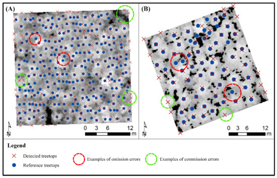 Examples of tree-to-tree matching. (A) Young forests with a stand density of about 3000 stems/ha; (B) mature forests with a stand density of about 700 stems/ha.