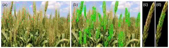 An example of manual annotation of target images; (a) a typical full-size image of spikes from a single planted row of wheat in the field; (b) the same image with annotated wheat spikes; (c) a segmented sub-image of a single wheat spike; (d) the individual wheat spike with annotated diseased areas.