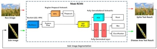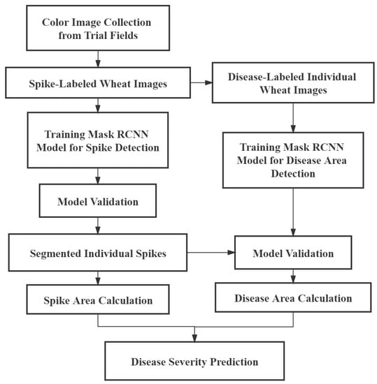 A ResNet model with 101 layers (ResNet-101) mentioned by He, Zhang, Ren and Sun [] was employed in this study. ResNet has outperformed previous networks such as visual geometry group networks (VGGNets) at many tasks including object detection and semantic image segmentation []. The purpose of using FPN is to completely extract multi-scale feature maps []. The RPN has the capacity to generate and choose a rough detection rectangle. Based on functional branches, three operations in terms of classification, detection, and segmentation can be performed. In addition, the batch normalization (BN) is added between activation functions and convolutional layers in the network to accelerate the convergence speed of network training. Ioffe and Szegedy [] proved that BN could reduce the training steps by more than ten times without changing the model accuracy. The original full-size images with annotated wheat spikes and the sub-images with annotated diseased areas were used, respectively, as the inputs to train two Mask-RCNN models for detection of wheat spikes and diseased areas. Based on the trained dual models, the segmentation of wheat spikes and FHB diseased areas of the images in the validation set was conducted (Figure 2). The severity of FHB was examined based on the ratio of the number of pixels of diseased area to the number of pixels of entire spike area. The workflow of this study is presented in Figure 3.