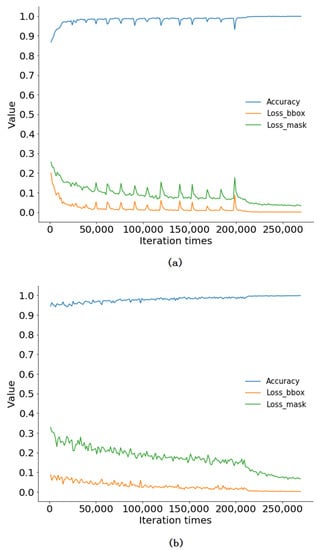 The performance of the Mask-RCNN was evaluated using several parameters. The false positive (FP), false negative (FN), and true positive (TP) were computed and used to generate metrics including recall, precision, F1-score, and average precision (AP). Among them, the recall (also known as sensitivity) is the proportion of the number of real positive instances in the total number of instances actually belonging to the positive category, while precision (also known as positive predictive value) is the proportion of the number of real positive instances among the total number of instances predicted as belonging to the positive category []. As a measure of accuracy of the test, the F1-score (also F-measure) is the harmonic mean of the recall and precision, where parameters are evenly weighted []. The AP is the area under the precision–recall (PR) curve []. The AP score is computed as the mean precision over 11 recall values (default values) given a preset intersection over union (IoU) threshold []. The IoU is defined as the degree to which the manually labeled ground truth box overlaps the bbox generated by the model. The mean intersection over union (MIoU) is a standard indicator for assessing the performance of image segmentation []. MIoU was computed as the number of TP over the sum of TP, FN, and FP. The precision, recall, F1-score, AP, IoU, and MIoU can be expressed by the following equations: