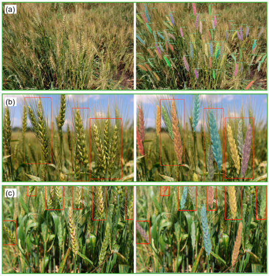 Selected examples of instance segmentation on correct detections of wheat spikes under three complex conditions in the test dataset, (a) high-density wheat spikes, (b) wheat spikes with overlapping boundaries, and (c) wheat spikes cut at the image borders. For each example, the original image (left) and the corresponding recognition result (right) are displayed.