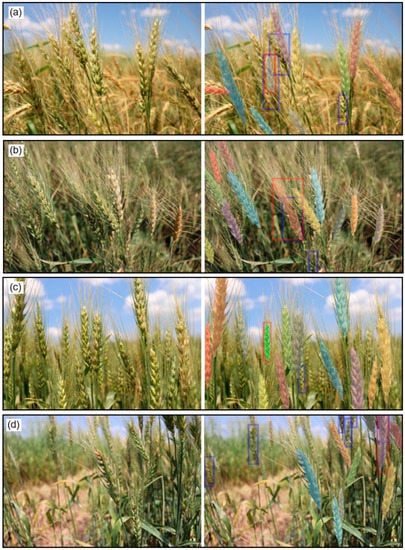The failures of the proposed methodology for wheat spike identification were also evaluated. Figure 6 depicts the predictions of selected wheat spike images from the validation dataset. As can be observed, most spikes were successfully detected. For spikes not detected, the FN were detection failures calculated in the cases of wheat spikes (blue rectangles) highly occluded (Figure 6a,c), cut at the image border (Figure 6b) or missing annotation on slightly blurred spikes (Figure 6d) due to human error. The FP were detection failures (red rectangles) caused by various factors, such as the presence of awns obscuring background spikes (Figure 6a,b), overlapping spikes (Figure 6d), and out-of-focus spikes (Figure 6c). These factors should not be considered by the model. Specifically, Figure 6a shows the misdetection (a blue rectangle with a red rectangle inside) of a wheat spike (blue rectangle) due to the occlusion of awns. In contrast, the detection (a red rectangle with a blue rectangle inside) observed in Figure 6b is a true spike (blue rectangle) covered by a red mask (red rectangle) that also has been obscured by the awns (presenting a similar pattern to spikes). This spike was undetectable due to the model error. Figure 7a,b show that there was one wheat spike misclassified as two spikes. The multi-detections were FP. As the number of long spikes in the dataset was not large, the specific features of these spikes were not fully learned by the algorithm, generating the same result as in the case of overlapped wheat spikes (Figure 7c,d).