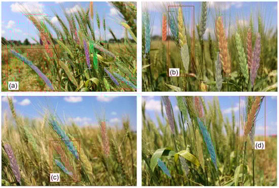 Results of instance segmentation of selected wheat spikes (red rectangles); (a,b) examples of multi-detections; (c,d) examples of wheat spike occlusion.
