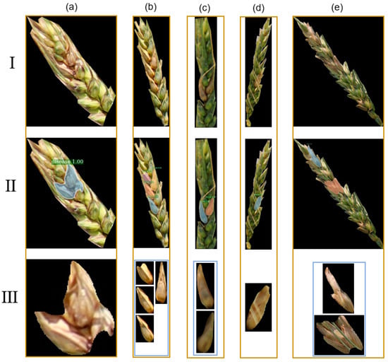 Illustration of (II) disease area detection and (III) segmentation results from (I) the individual wheat spikes in test set; (a) diseased areas with shadow; (b) diseased areas under strong light; (c) diseased areas under low light; (d,e) diseased areas under awn occlusion.