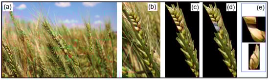 The process of disease detection for an entire wheat spike partially occluded by the peduncle (neck) of another plant; (a) a selected example of an original image with multiple wheat spikes; (b) a zoom-in view of a spike occluded by a peduncle; (c) Mask-RCNN for wheat spike detection; (d) Mask-RCNN for disease area identification; (e) the segmentation result of diseased spikelets.