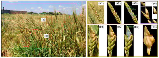 - Leplat, J.; Mangin, P.; Falchetto, L.; Heraud, C.; Gautheron, E.; Steinberg, C. Visual assessment and computer–assisted image analysis of Fusarium head blight in the field to predict mycotoxin accumulation in wheat grains. Eur. J. Plant Pathol. 2018, 150, 1065–1081. [Google Scholar] [CrossRef]