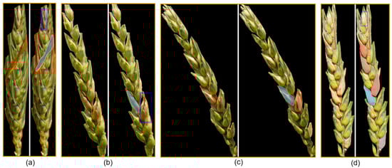 Although the trained model showed excellent performance in disease area recognition, there were difficulties in some cases. Figure 10 shows selected examples of incorrect segmentation of FHB diseased areas. As can be seen, the diseased areas of two wheat spikes were not successfully detected, including the one with the presence of multi-detections (Figure 10a1–a4) and a highly occluded one (Figure 10b1–b4). Such errors were associated with FP. As shown in Figure 11a, this detection failure (red rectangle) was reported as FP caused by the occlusion of awns. Other FP detections included were spikelets that were misannotated when labeled due to human error (red rectangles in Figure 11c,d). The undetected wheat spikelets (blue rectangles) in Figure 11a,b,d were the FN due to the model error. In addition, environment factors including sunlight reflection or appearance variations of the diseased areas in view angle, shape, or occlusion may result in the failure identifications.