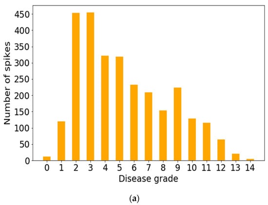 Data annotation task is a very laborious and time consuming and very complex progress. There is a need for more senior experts to annotate input images, as existing experts may be susceptible to errors when facing a challenging task in disease annotation. In the future, it should also be possible to make the annotation automatically by the more advanced software. This kind of automation will be the process desired for the future application of our algorithm. The differences between blue bars and orange bars in Figure 12 were due to false positives (disease grades 1–4) or false negatives (disease grades 5–12). These false rates could affect the decision making when selecting resistant lines. This would underestimate the disease grade of a wheat line, which means that the disease grade of this wheat originally belongs to a high grade, but it may be classified into a lower disease category by the model. Nevertheless, this methodology yielding an accuracy of 77.19% is good for breeders as manually screening hundreds of wheat lines will also be inaccurate and this process is very time-consuming and inefficient. Although it is very difficult to overcome human errors, the annotation of all spikes for modeling can be achieved by carefully labeling. A big barrier in the use of Mask-RCNN is the need for more representative and larger datasets including wheat spikes with awns and overlapping in model training. Samples under different climatic conditions should be collected in the future. In addition, the number of samples should be increased by data augmentation to establish a more robust model and avoid the potential overfitting problem. A high-throughput method utilizing streamlined image analysis for real-time FHB assessment in the field could be developed, thus helping to reduce the amount of time, cost (labor), and subjectivity error from conventional manual phenotyping methods. Recently, Zhang et al. [] developed an FHB diagnostic system for detection of individual wheat spikes with a black cloth background. Only 79 samples were used for training and a very small dataset of 41 wheat spikes were tested in the study. In contrast, the sample number was much larger in our study. In total, 524 images with 12,591 wheat spikes and 166 images with 4749 wheat spikes were utilized. These images were taken under complex backgrounds (including blue sky, white clouds, and green wheat plants) in the field.