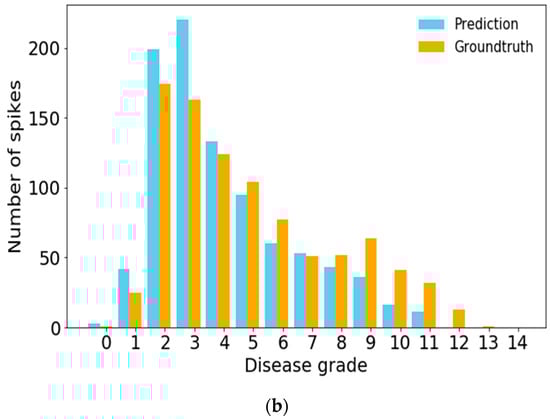 The FHB disease severity was evaluated according to the ratio of the disease area to the entire spike area. As shown in Figure 12, disease levels of each spike were calculated and divided into 14 FHB severity grades. Spikes with lower disease levels were separated into more numerous grades with narrower severity intervals, because selecting among lines with lower disease levels is more critical to the breeding process, as lines with high disease levels are undesirable. Figure 12a depicts the ground truth (ground truth is the visual rating of spikes by an expert from the acquired images) of wheat spikes at different disease grades in the training set. As seen in Figure 12a, 83.51% of samples in the training set were categorized with disease grades of 2–9, while 87.74% of the ground truth in the validation set was assigned to this group, which was a little bit lower than that (92.10%) in the prediction set as described in Figure 12b. The statistical results of the FHB severity of wheat spikes in the training and validation sets are shown in Table 4. By inspecting the distribution of samples, it was observed that the ground truth of FHB severity in the validation set was close to that of the training set. The overall predicted ratio of the disease area over the entire spike area was 9.27% (grade 4) based on data in validation set. For 92.10% of wheat spikes, the infected area of an individual spike ranged from 2.5% to 25% (grades 2–9). Samples with infection areas of 2.5% to 10% (grades 2–4) accounted for 60.59%, followed by the 27.55% samples with the infection area between 10% and 20% (grades 5–9). When the disease level was over grade 4, it was observed that the predicted number (e.g., 95 for grade 5) of the diseased wheat spikes in each grade was lower than the ground truth (e.g., 105 for grade 5). In disease grades 5–12, the differences between blue bars and orange bars are the false negatives. When the disease level was no more than grade 4, the predicted number (e.g., 133 for grade 4) of spikes in each grade was higher than its actual number (e.g., 124 for grade 4). These differences in categories (1–4) are the false positives. Nevertheless, the average disease severity (9.27%) from the prediction was comparable to that of the ground truth (12.01%). Eventually, the prediction accuracy (77.19%) for diseased wheat spikes was calculated by the severity value of prediction (9.27%) over ground truth (12.01%).