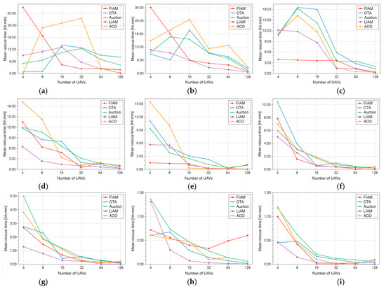 Figure 6 shows the 12 subfigures of the mean rescue times of FIAM, OTA, auction, LIAM, and ACO algorithms. Generally, the results show that FIAM outperformed OTA, auction, and ACO algorithms in terms of mean rescue time, with the measure’s value decreasing as the numbers of survivors and UAVs were increased throughout the simulations. However, observing FIAM performance with a small number of UAVs (Figure 6a,b) indicates that FAIM takes a relatively longer time to rescue a survivor compared to the benchmarks. Regardless, these results should not be interpreted in isolation from Figure 5a,b, where FIAM comparatively rescued the largest number of survivors. In most other scenarios, when only four UAVs were used by FIAM, higher rescue times were also observed. This result could be attributed to the fact that the schooling behavior employed in FIAM cannot be demonstrated with a single fleet of UAVs (i.e., four UAVs, with one sampler UAV and three follower UAVs). In these scenarios, the UAVs will pursue survivors within the same region. If this region happens to exhibit low profitability then survivors in other regions would wait longer before being discovered. Similar to what is reported in Figure 5, ACO was halted early when the number of survivors increased to 256 or more (see Figure 6h–l) due to the complexity of the algorithm.
