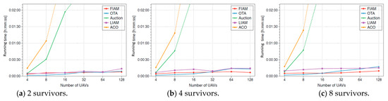 Furthermore, observing the running time performance of OTA, it can be deduced that the algorithm maintains the lowest running time in scenarios with limited numbers of UAVs (less than 32) and survivors (less than 512). This is because OTA implements a naive greedy strategy. Nevertheless, the OTA running time performance gradually increased as the number of survivors and UAVs were increased, an observation that is consistent with the finding in [18] where the complexity of O(nm), rather O(n) was suggested for OTA. In contrast, the running time performance of FIAM remained almost steady in all scenarios. This result is likely because the allocation of tasks in FIAM is a local inexpensive decision irrelevant to the number of UAVs or survivors.