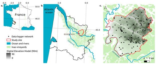 (a,b) The Saint-Emilion and Pomerol study site (red border) and the administrative department of Gironde (black border) in southwestern France, and (c) the study site’s topography and network of 90 air temperature data loggers (black points).