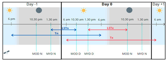 Chronology of acquisition of air temperature (sensors) and land surface temperature (LST) (Terra (MOD) and Aqua (MYD) satellites for (N)ighttime and (D)aytime. Blue arrows indicate calculation intervals of mean daily minimum air temperature (Tn) and LST (LSTn), while red arrows indicate those of mean daily maximum air temperature (Tx) and LST (LSTx).