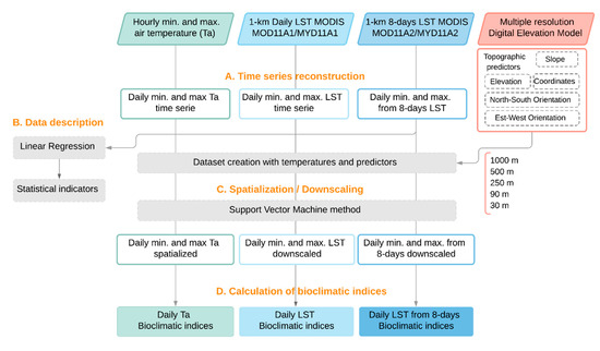 Flowchart of the general method used for data: air temperature (Ta), daily land surface temperature (LST) (MOD11A1/MYD11A1), weekly LST (MOD11A2/MYD11A2) and multiple resolutions of digital elevation models. (A) Times series reconstruction, (B) Data description, (C) Spatialization of air temperature and downscaling of LST, (D) Calculation of bioclimatic indices for the growing season.