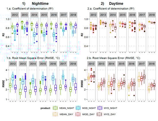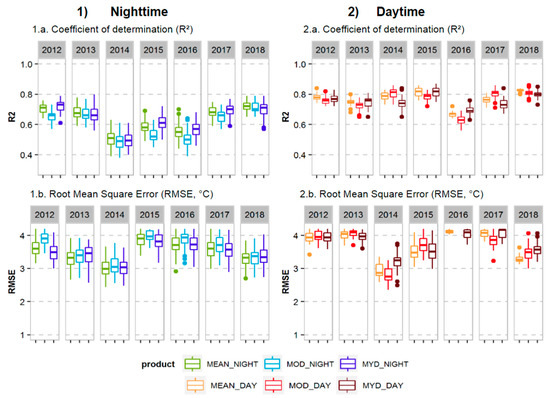 Linear relationships between daily LST from the 8-day composite (M*D11A2) and daily air temperatures showed, like for daily LST, slightly better results for daytime data than nighttime data, with higher R2 and lower RMSE) (Figure 5). Most results were not as good as those for the daily LST data. Since weekly data were pixel-averaged over 8 days, they were more repetitive than daily data and had less variable temperature. Peaks in minimum or maximum temperatures during each day were less visible (Figure 4 Results varied greatly among years. For example, the mean of the nighttime data of the MODIS products (MEAN_NIGHT) had R2 from 0.50 (2014) to 0.72 (2018) but similar RMSE. Averaging these indicators over the growing season precluded determination of the intra-annual variability.