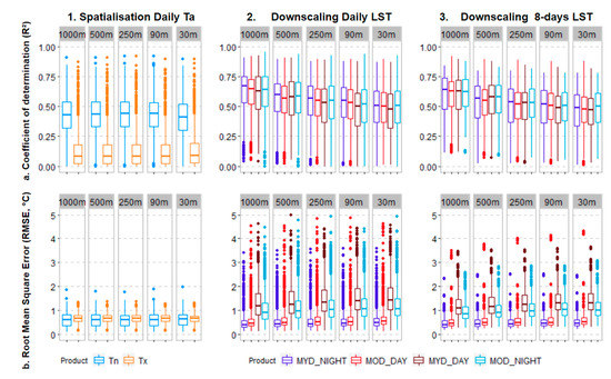 Boxplots of statistical indicators of the downscaling of (1) spatialization of air temperature, (2) downscaling of daily land surface temperature (LST) and (3) downscaling of the 8-day composite LST using the support vector machine algorithm gridded at different spatial resolutions, by the type of product for each year studied: (a) coefficient of determination (R2) and (b) root mean square error (RMSE, in °C).