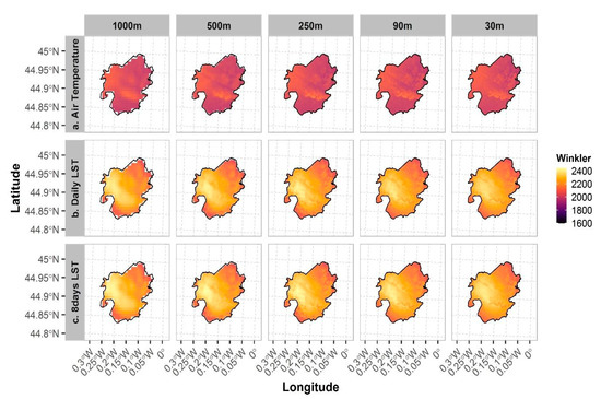 Spatial distribution of the Winkler index averaged from 2012–2018 and gridded at different spatial resolutions using (a) predicted air temperature, (b) downscaled daily land surface temperature (LST) (M*D11A1) and (c) downscaled 8-day LST (M*D11A2).