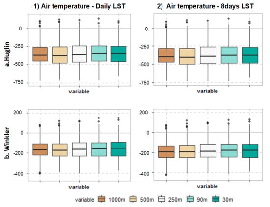 Distribution of differences (°C) between (1) daily air temperature and daily LST and (2) daily air temperature and 8days LST using to calculate the (a) Huglin and (b) Winkler bioclimatic indices at different spatial resolutions.