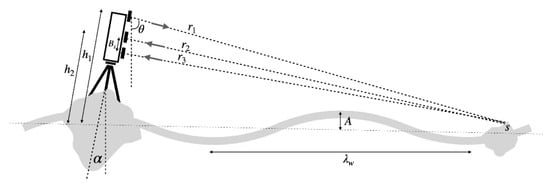 Geometry illustration of the GPRI mounted on a ridge. The three antennas are each associated with a height above the level ice surface, h, a range to a specific target, r, and an incident angle, θ. The GPRI is free to tilt at an angle, α, relative to a level reference point due to ocean waves with amplitude, A, and wavelength, .