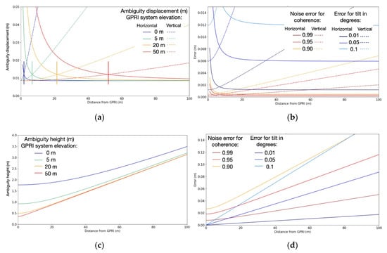 (a) Horizontal and vertical ambiguity displacement for a GPRI stationed at different elevations. Vertical lines indicate the range distance of equal sensitivity to vertical and horizontal motion. (b) Error in horizontal (solid lines) and vertically (dashed lines) derived motion based on coherence (warm colors) and surface tilt (cool colors) if stationed on a 5-m ridge. (c) Ambiguity height for a GPRI stationed at the same levels as in (a). (d) Error in height estimates with similar coherence and tilt values as in (b).