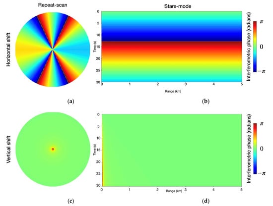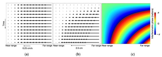Interferometry is a technique for measuring the difference in returned phase between two radar scenes commonly used for deriving surface topography or sub-pixel, wavelength-scale surface displacements. Interferograms can be generated from either synthetic aperture radar (SAR) or real aperture radar using a similar processing chain including co-registration, multi-looking, interferogram formation, and adaptive phase filtering [,]. The resulting interferogram consists of phase change values wrapped between −π and π. The phase change, , represents a combination of several factors: