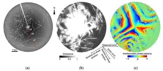 Stare-mode acquisition acquired 4 March 2020 and derived backscatter (a), coherence (b) and interferometric phase (c). Strong scatterers s5–s7 can be identified in (a). σ0 is not calculated in (a) as absolute calibration was not performed.