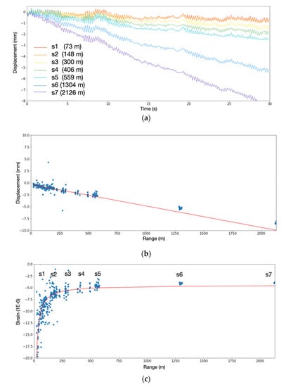 (a) Derived horizontal displacement of strong scatterers (s1–s7) distributed between near and far range. Total displacement (b) and strain (c) at last timestep for all scatterers exhibiting high (>0.98) coherence. Displacement in (b) indicates increasing displacement with distance. The slope indicates the average strain at 4.6 mm/km. The strain in (c) indicates a gradual tilting of the antenna of 0.3 mm during the time of the acquisitions.
