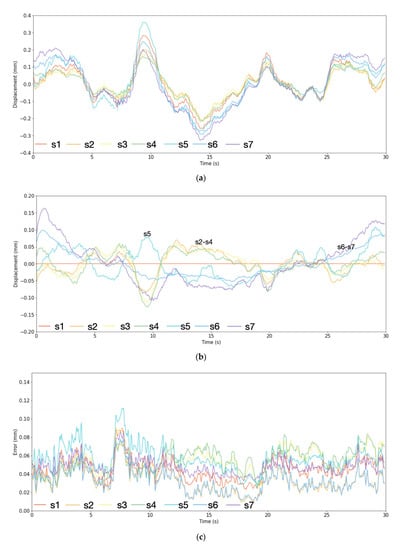 (a) Detrended and smoothed horizontal displacement. (b) Residual displacement relative to s1 (red line in (a)). (c) Accuracy of displacement based on coherence and assuming 5 independent looks.