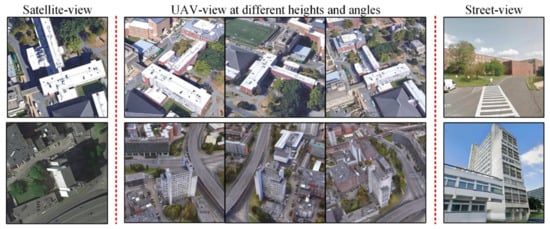 The dataset used in this study is University-1652, released by Zheng et al. [46], which contains 1652 buildings (1652 locations) from 72 universities worldwide. Each building consists of images from three different views, including satellite view, UAV view, and ground view (street view). Additionally, each building in the dataset has only one satellite-view image, 54 UAV-view images from different heights and angles, and one or more ground-view images. Satellite-view images and UAV-view images are adopted in this paper. Please note that the satellite-view images can be satellite images or aerial images because whether a satellite-view image in University-1652 is from a satellite or aircraft is unknown to users. Therefore, considering that the view of the aerial image and the satellite image are close, the “satellite-view image” is used in this study. Besides, the satellite-view image is vertical and the UAV-view image is oblique. Figure 1 shows several images from the three views.