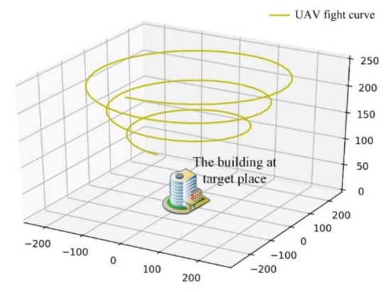 Due to the airspace control and high cost, real UAV-view images of 1652 buildings are difficult to obtain by actual flight. An alternative solution was using the synthetic UAV-view image obtained through simulation to replace the real UAV-view images. The synthetic UAV-view images are obtained by simulating UAV flight based on the 3D building model on Google Earth through the following steps. First, the 3D model of the corresponding building was found according to the name and geo-tag. Second, the UAV simulation video of the 3D building and surrounding environment was obtained according to the pre-set UAV flight path. The schematic diagram of the UAV simulation flight is shown in Figure 2. In order to make the synthesized images contain the multi-angle information of buildings, the UAV flight path is set to a spiral curve. Throughout the simulation process, the flight height is reduced from 256 to 121.5 m. This flight path can make the synthesized image close to the real situation [47,48]. We call synthetic UAV-view image UAV-view images (please note that it is not “UAV images”) because these images were obtained based on the simulated UAV view and are therefore close to the real UAV images. It should be noted that only 1402 buildings out of 1652 buildings have 3D models, and the remaining 250 buildings lack 3D models or street-view images. In addition, real UAV images of ten buildings were additionally provided.