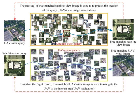 Remote sensing technology has been developed rapidly in the past few decades, and remote sensing platforms have gradually become diversified, such as ground, aerial, and satellite platforms. Satellites, airplanes, and unmanned aerial vehicles (UAVs) have been the main carriers in the acquisition of remote sensing images. In particular, the UAV has the advantages of strong maneuverability, convenient operation, being hardly influenced by cloud, strong data acquisition abilities [1,2,3], etc., which make it widely applied in various fields [4,5,6,7,8,9,10,11,12]. How to efficiently locate the UAV images without geo-tags and navigate the UAV when the positioning system (e.g., GPS) is not available still face great challenges that are expected to be solved. Image-based geo-localization is an emerging technology in cross-view information integration and provides a new idea for UAV image localization and navigation. It is able to locate images without geo-tags based on images with geo-tags, so as to better serve UAV image localization and navigation. The key to solving this problem is the cross-view image matching between the images without geo-tags and the images with geo-tags.