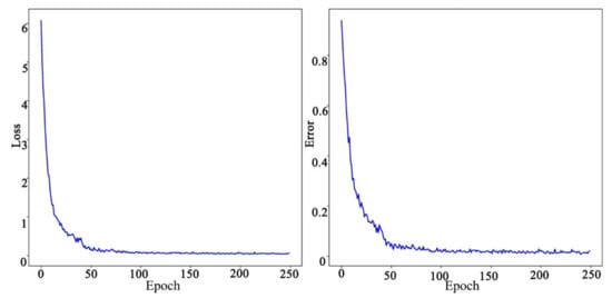The variations of the two significant parameters, i.e., loss and classification error, during the training process are shown in Figure 5. Loss is the average value of the cross entropy; classification error is the average probability of the image being misclassified. Because the LCM is not a classification model, the loss and classification error in the test dataset cannot be calculated. To enable the model to learn the optimal parameters, 250 epochs are used in this study. The smaller loss and classification error means that the model can more classify satellite-view images and UAV-view images of the same target location into one class accurately, which suggests that the model can map image features from two views to the same space. Besides, if a target building is included in the training dataset, the method is able to classify images of the building with the same origin (both UAV or both satellite) into the same class. If a target building is not included in the training dataset, the method will classify images of the building with the same origin (both UAV or both satellite) into the same class by relying on the feature similarity between the image of the target building and the image in the relevant gallery. After 50 epochs, loss and classification errors are quickly reduced to 0.198 and 3.56%, respectively. After 100 epochs, loss and classification errors tend to converge. After 250 epochs (approximately 58 min), loss and classification error were reduced to 0.045 and 1.16%, respectively. These results show that LCM model has the advantages of fast convergence and short training time. In addition, the results also indicate that inputting the satellite view and UAV view of the same target location to the classification model without differences performs well. In other words, the proposed LCM can map image features from two different views to the same space through classification.