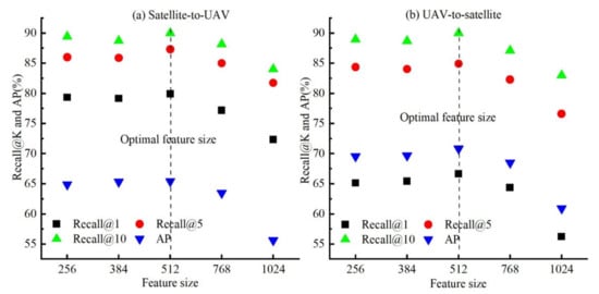 As shown in Figure 8, we cannot find the phenomenon that a larger feature vector size can lead to a higher Recall@K and AP. The relationship between the matching accuracy and the feature size can be divided into two cases. The first case is when the feature size ranges from 256 to 512, Recall@K and the AP become larger as the feature size increases. When the feature size is 512, the LCM has an optimal matching accuracy. However, the matching accuracy exhibits relatively low variations in this case. For satellite-to-UAV, Recall@1, Recall@5, Recall@10, and AP increase by 0.57%, 1.32%, 0.59%, and 0.51%, respectively; for UAV-to-satellite, Recall@1, Recall@5, Recall@10, and AP increase by 1.51%, 0.57%, 1.07%, and 1.29%, respectively. In the second case, when the feature size ranges from 512 to 1024, Recall@K and AP decrease as the feature size increases. When the feature size is set to 1024, the lowest matching accuracy is shown. Compared with the first case, the matching accuracy varies relatively more rapidly in this case. For satellite-to-UAV, Recall@1, Recall@5, Recall@10, and AP decrease by 7.56%, 5.60%, 6.01%, and 9.77%, respectively; for UAV-to-satellite, Recall@1, Recall@5, Recall@10, and AP decrease by approximately 10.42%, 8.32%, 7.01%, and 9.91%, respectively. Obviously, 512 is the optimal feature size. This is why we used this feature size in the LCM model (see Section 4.1).