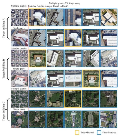 To investigate the effectiveness of using multiple queries more clearly, we visualized the matching results of multiple queries and a single query of three target buildings (targets A, B, and C). The visual details are shown in Figure 9. For the target buildings A and B, the true-matched satellite-view images appeared in the third and fourth position in the ranking of the matching results when we use a single query. When we use multiple queries, the true-matched satellite-view images all appeared in the first position in the ranking of the matching results. For target building C, the true-matched satellite-view image does not appear in the top five in the ranking of the matching results. When we use multiple queries, the true-matched satellite-view image appeared in the third position in the ranking of the matching results. These results demonstrate that multiple queries can indeed improve the matching accuracy of UAV-to-satellite when we use the LCM. For satellite-to-UAV, because only one satellite-view image can be used as a query of the target location, the experiments of multiple queries cannot be conducted.